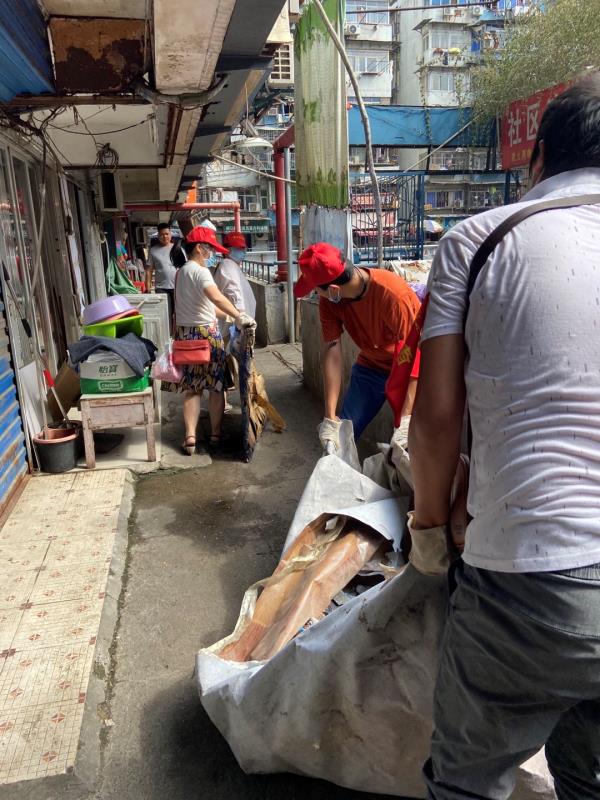 9月4日上午,市医保局下沉干部服务队数名党员前往党建共建社区——硚口区汉正街全新社区开展清洁家园活动。全新社区属于开放式商住一体的老旧小区,既有各类经营者,也有居家住户,且外来租户居多,管理难度大。片区内卫生状况较为恶劣,生活垃圾、生产废料乱扔,存在一些卫生死角。市医保局下沉党员联合社区工作人员、区直部门下沉干部一道对社区内的多处卫生死角、乱停乱放单车等进行了清理。全体党员分工明确、干劲十足,大家不顾垃圾散发出的阵阵恶臭,不惧垃圾堆内的老鼠、蟑螂等,齐心协力清理腐败不堪的旧家具、床垫、棉絮、生产废料等杂物,将一个个卫生死角打扫得干净整洁,焕然一新,赢得居民一片称赞。
