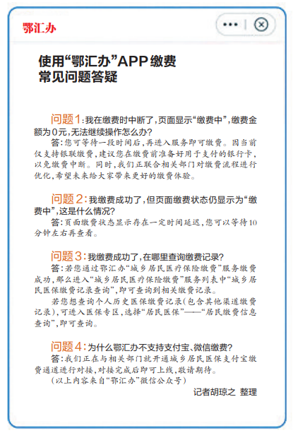2021年度武汉市城乡居民医保缴费进入倒计时阶段,针对“线上缴费”的参保人在操作过程中遇到一些小问题。20日,记者整理了“湖北税务”APP和“鄂汇办”APP两个线上缴费通道的相关信息。