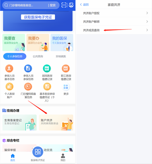 进入首页“在线办理”点击“账户共济”,进入“家庭共济”界面,选择“共济成员查询”选项。