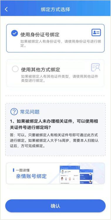 3.点击“添加我的家庭成员”,进入“绑定方式选择”界面,选择“使用身份证号绑定”,点击“确认”。