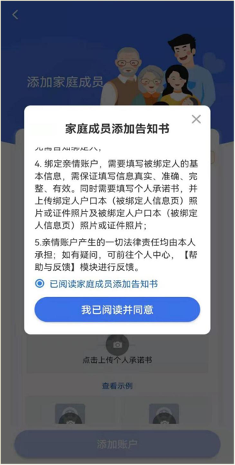 4.进入“家庭成员添加告知书”界面,阅读并同意后,选择“已阅家庭成员添加告知书”,点击“我已阅读并同意”。